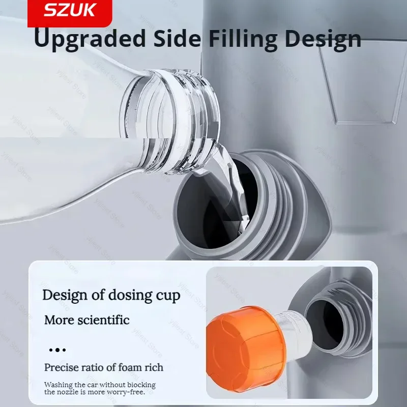 The SZUK Electric Foam Sprayer is powered by a motorized system that transforms manual labor into effortless performance. Its powerful motor produces dense foam in seconds, ensuring thorough cleaning with minimal physical effort. The rechargeable battery provides hours of continuous operation, ideal for washing several vehicles without interruption. Users appreciate the USB charging capability that allows easy recharging from any power source, whether at home or in a workshop. This energy-efficient motor minimizes noise while maximizing pressure, offering a quiet yet powerful experience. With its cutting-edge technology, the sprayer adapts perfectly to modern eco-friendly lifestyles. Customers in Europe and North America have praised its convenience for both personal and professional use. The rechargeable nature of this foam cannon eliminates the need for disposable batteries, aligning with sustainable cleaning solutions that reduce environmental impact. This makes the SZUK Electric Foam Sprayer a must-have for conscious consumers who prioritize both quality and responsibility.
